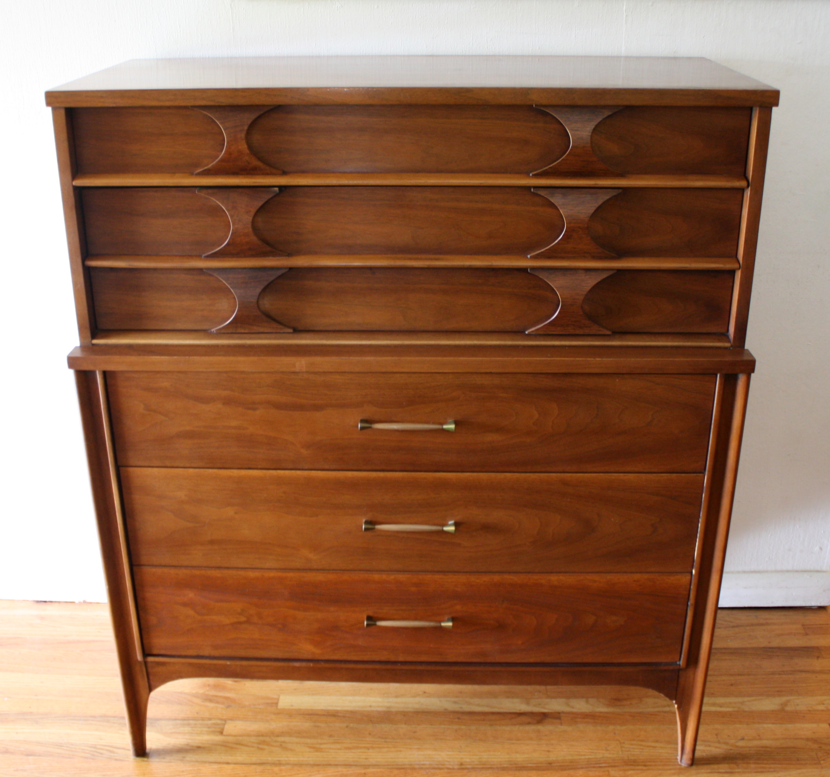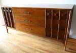 This is a selection of mid century modern side table nightstands. The first is a demilune table from the Kent Coffey Perspecta line. It has the signature arched design, drawer and cabinet: 25″W x 17″D x 25″H. The second is table is by Lane, has beautiful angles, 1 dovetailed drawer incorporated into the design, and tapered legs: 29″D x 21″W x 21″H. The third table is from the Lane Acclaim series. It is a square side table that has its signature dovetailed design, tapered legs, and lower shelf: 23″W x 23″D x 21″H.