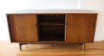 This is a mid century modern bar cabinet that has a beautiful tile top with an extension leaf on one side for extra serving space when needed. On the other side behind a fold away door, is a bar cabinet that has a pull out top shelf with spacers for glassware and an ice bucket. There is also a bottom shelf that holds bottles and more bar ware accessories. Dimensions: 33″W x 20″D x 28″H. The extension leaf adds an extra 11″D, for a total of 31″D when fully extended.