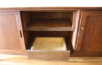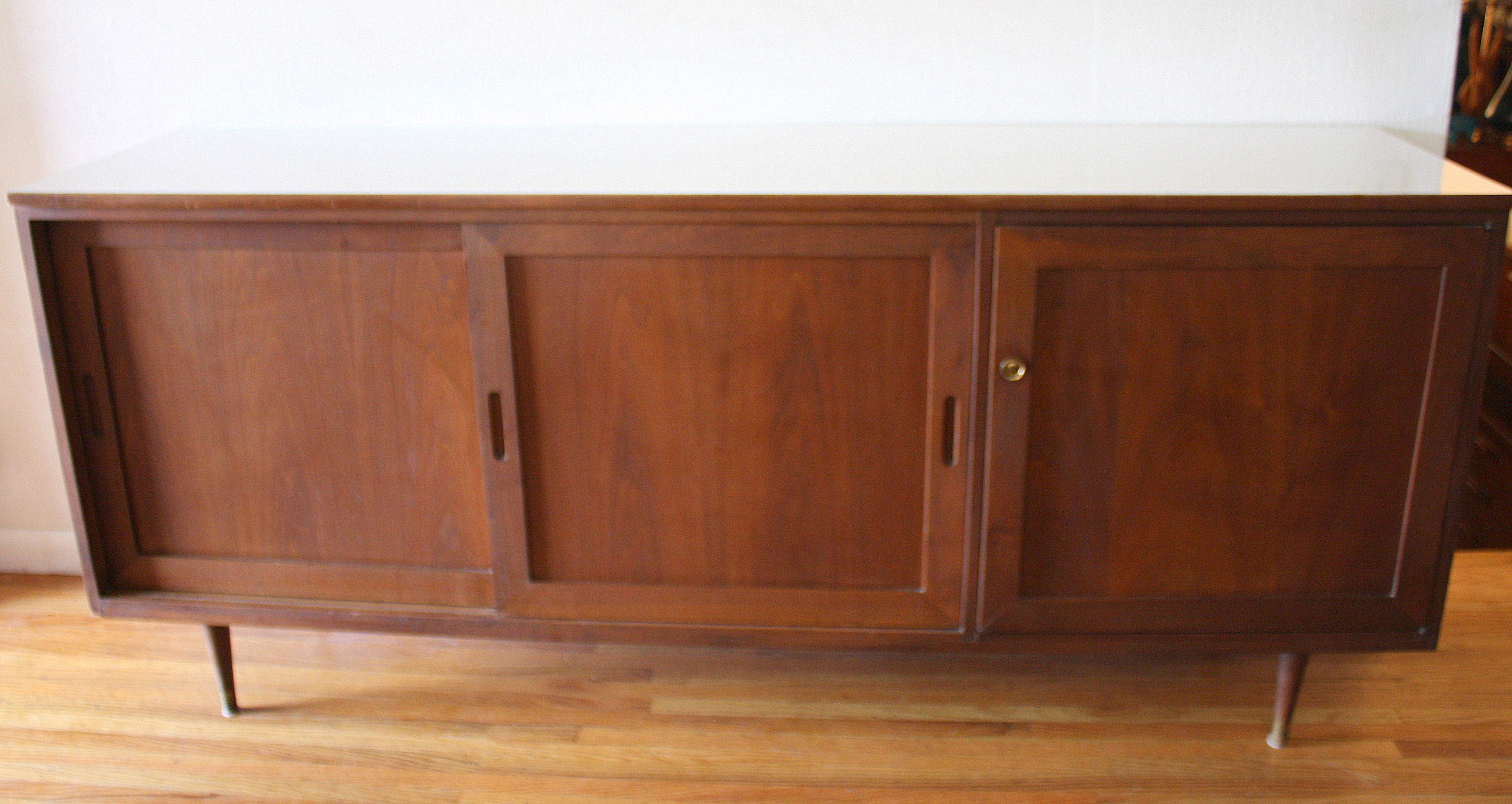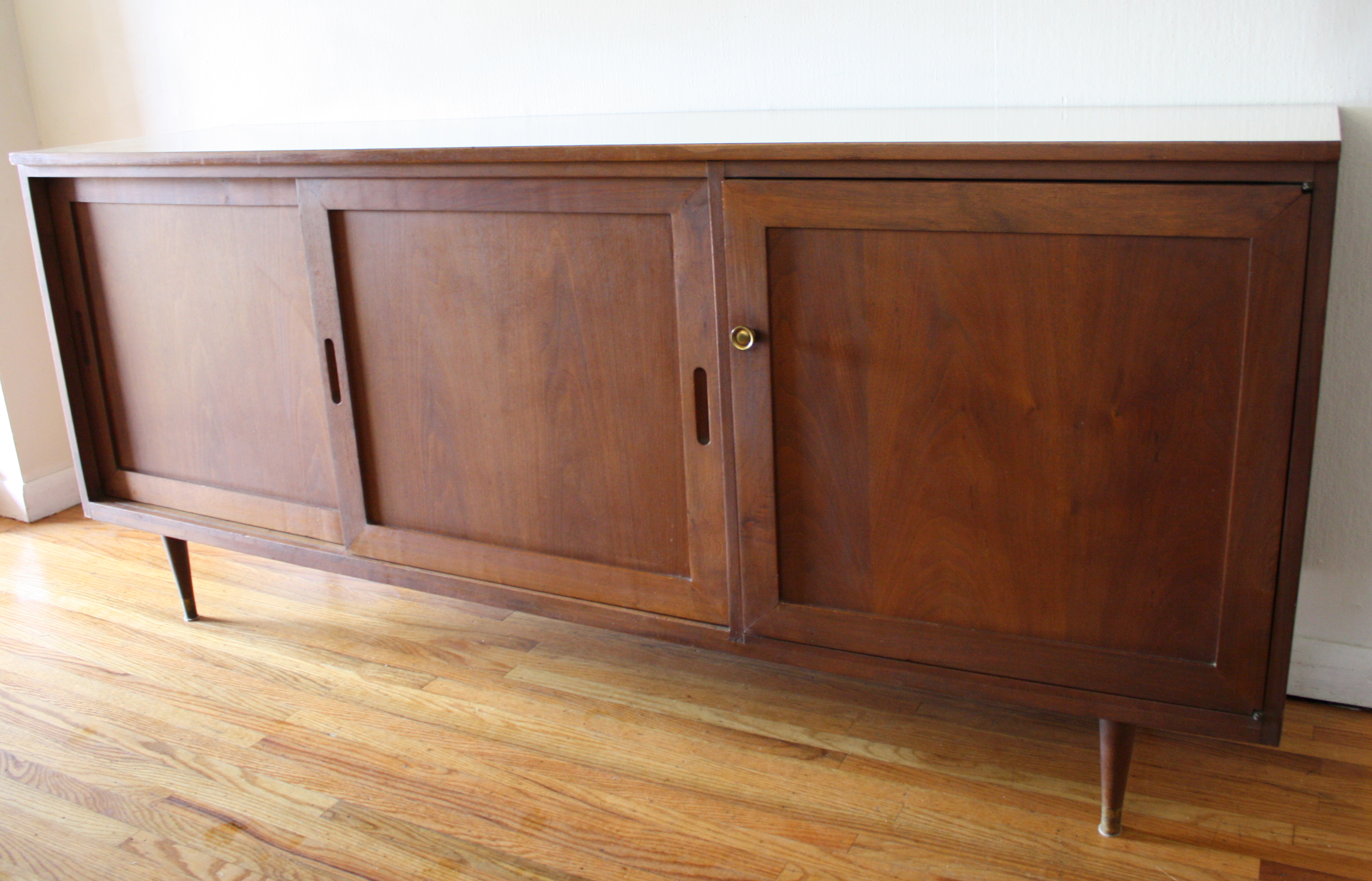 This is a mid century modern credenza media cabinet console. It has a mod white top, tapered legs, and 3 different compartments. The left and middle compartments have sliding doors and drawers. The right side compartment has a shelf and record slats that are removable. Dimensions: 71.5″W x 18″D x 31.5″H.