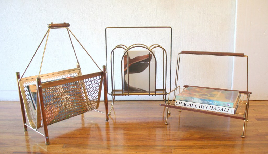 These are 3 mid century modern brass with wood accents. From left to right, the first (left) magazine holder’s dimensions are: 16.5″W x 11″D x 23.5″H. The second (middle) dimensions are: 16.5″W x 8.5″D x 21.5″H. The third (right) dimensions are: 17.5″W x 17″D x 16″H.