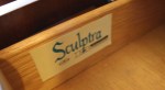 This is a mid century modern shelving unit that is symmetrically finished on both sides, and can also be used as a room divider. It has a tapered curved edge design, tiers of top shelves and a bottom cabinet with record slat storage. The slats are removable. Dimensions: 34″W x 16.5″D x 70″H.