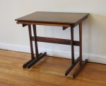 This is a pair of rare mid century modern side end tables by Lane. They have a rosewood inlay floral design, surfboard edges, bottom shelves, and tapered legs. Dimensions: 28″W x 21″D x 20″H.