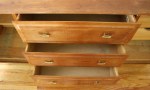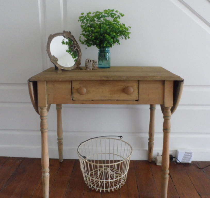 This antique farm table has a beautiful patina and rustic look. It’s solid wood top has gorgeous wear, 2 folding leaves, and sits on top of a painted solid wood base. There is a small cute drawer. Dimensions: 23″W leaves down, 53″W both leaves up, 33″D, 29″H.