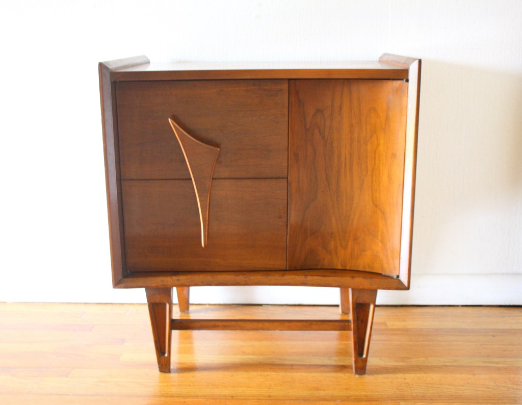 This is a mid century modern tall dresser from Broyhill’s Emphasis series. It has 5 dovetailed drawers with their signature tapered pulls, and sculpted tapered legs. Dimensions: 40″W x 19″D x 45.5″H.