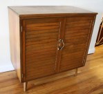 This is a mid century modern slatted server cabinet made of solid wood. It has solid wood shelves, tapered legs, and beautiful brass handles. Great to use as a kitchen or serving cabinet, console table with storage, the list goes on…