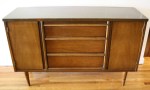This is a mid century modern credenza made of solid wood by Bassett. It has three dovetailed drawers and two side cabinets that open easily. It is perfect for smaller spaces and has the signature mcm tapered legs.