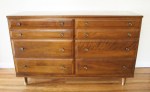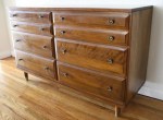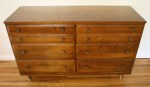 This is a mid century modern solid wood low dresser by Basic Witz. It has 6 beautiful dovetailed angled drawers and 3 additional smaller drawers in the middle. It has the maker’s marks inside the drawer and the signature tapered legs. Also great as a credenza, buffet, sideboard server or media center.