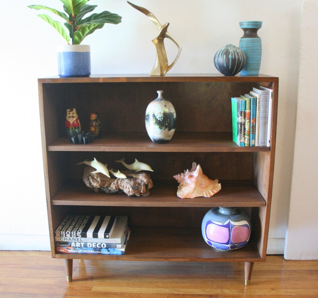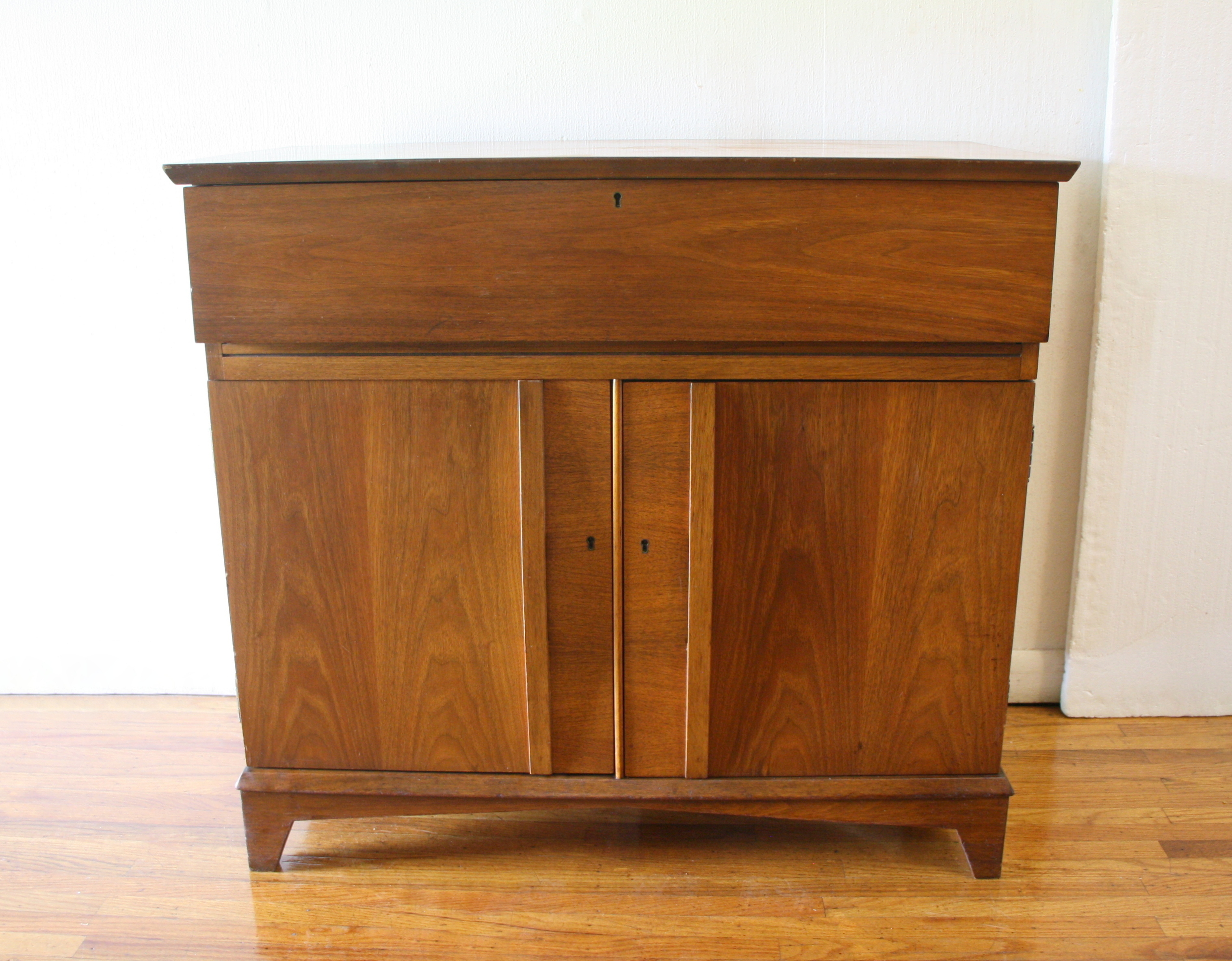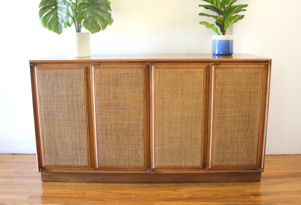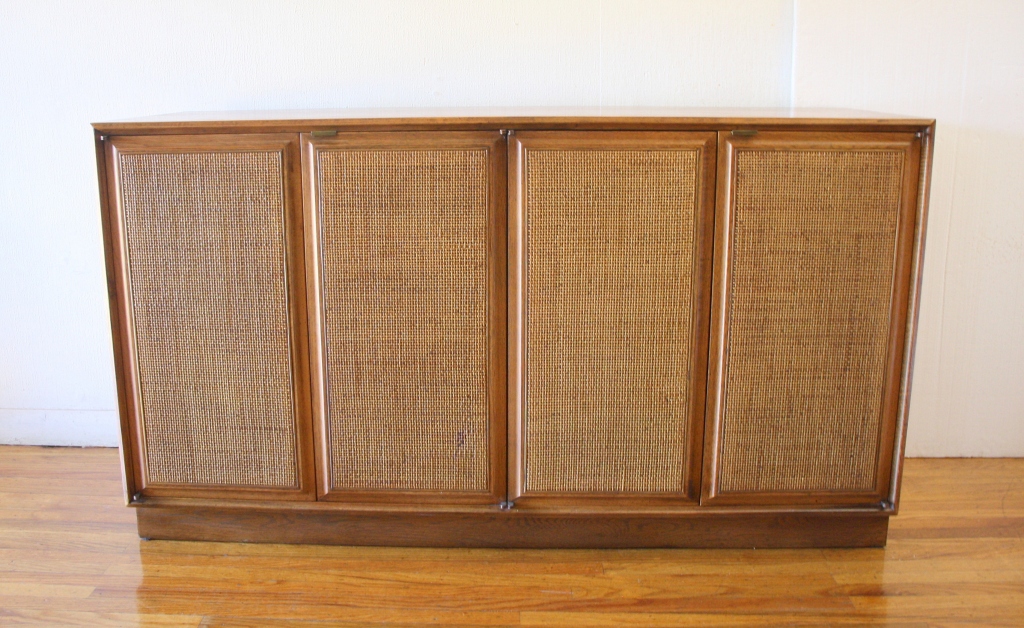 This is a mid century modern teak credenza that has a beautiful wood grain outside and in, 3 dovetailed drawers with an arched pull design, and bottom shelf. Dimensions: 56″W x 17.5″D x 29″H.