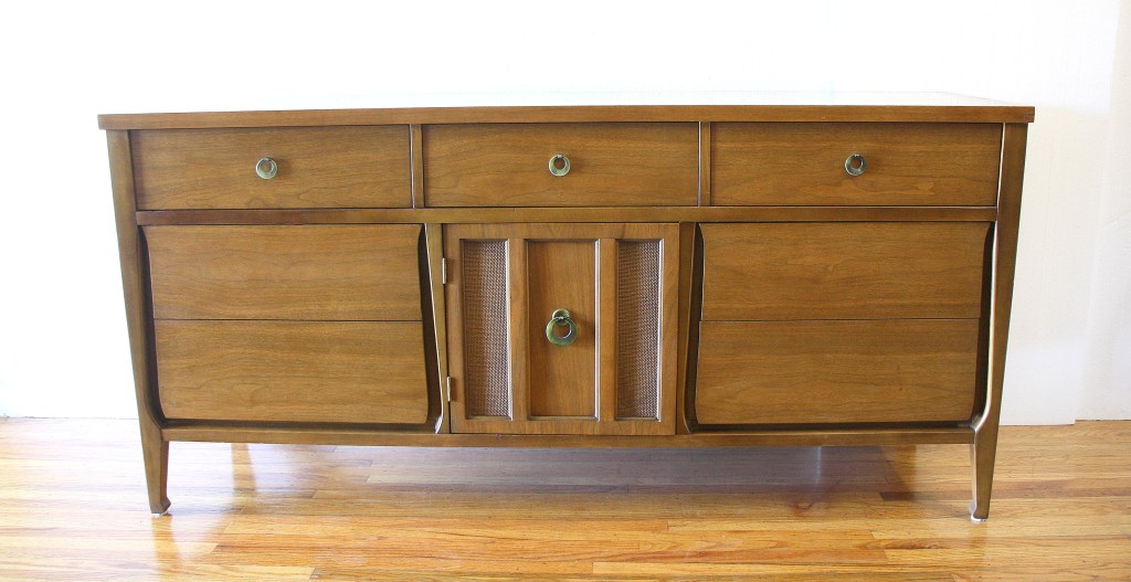This is a mid century modern low dresser credenza by Bassett. It has six dovetailed drawers with silver knobs and angled pulls, and tapered legs. Dimensions: 56″W x 19″D x 30″H.