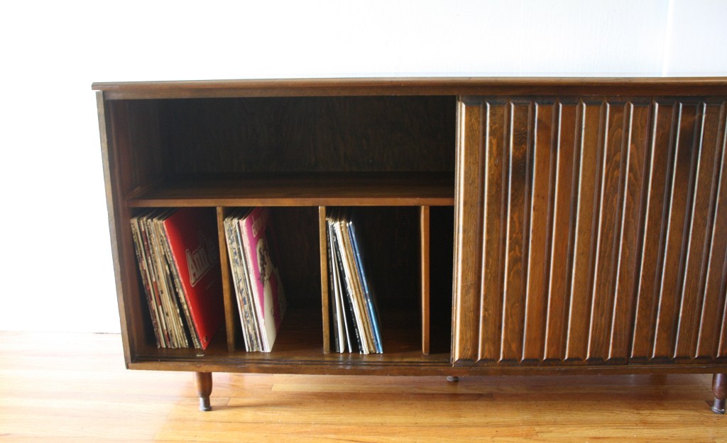 This is a mid century modern credenza with four easy sliding doors with a slatted streamlined design, record slat storage, shelving, and tapered legs. Dimensions: 59″W x 18″D x 30″H.