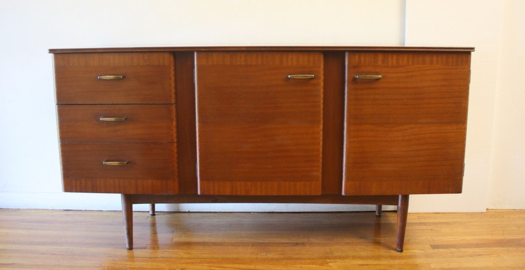 This is a mid century modern credenza with a large 2 door cabinet with shelving, 3 dovetailed drawers with beautiful brass pulls, and tapered legs. It has art deco curves in its design and a beautiful wood grain. Dimensions: 60.5″W x 18″.25″D x 31″.25″H.