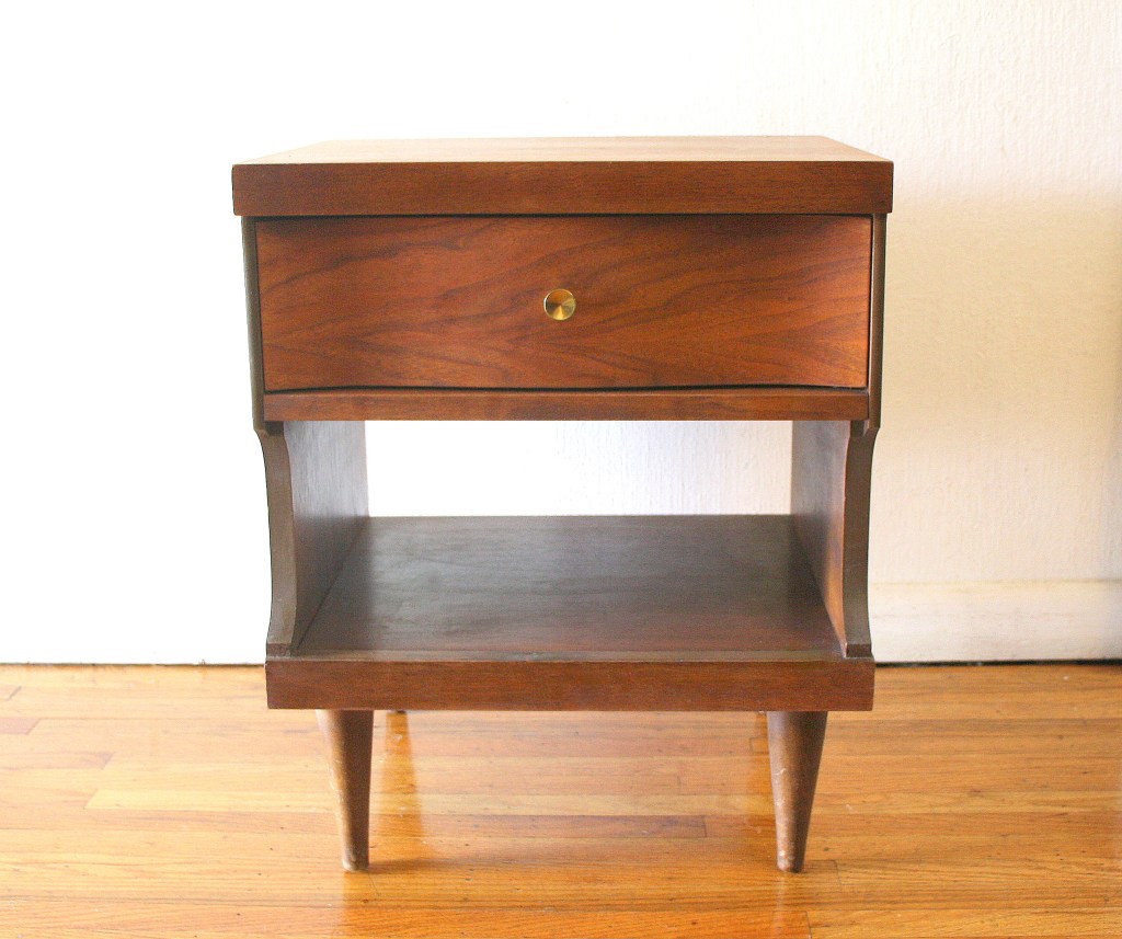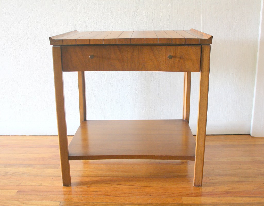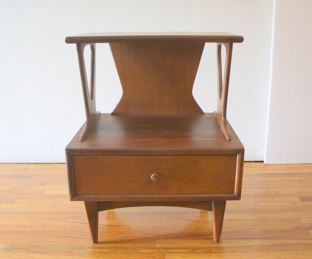These are 4 single mid century modern side end table nightstands. The first is a 2 tiered table from Kent Coffey’s Sceptre series, with beautiful geometric sides, arched base with tapered legs, and 1 dovetailed drawer with brass knob: 16″W x 29″D x 25″H. The second table has 1 dovetailed drawer with a rippled design, bottom shelf, and tapered legs: 18″W x 155″D x 22″H. The third is from Drexel’s Design for Living series, has curved surfboard edges, a gorgeous wood grain, 1 dovetailed drawer with brass knobs, and a bottom shelf: 24″W x 19″D x 24.5″H. The fourth is by Bassett, has 2 dovetailed drawers with black and silver pulls: 24″W x 16″D x 23″H.