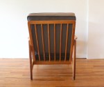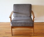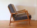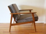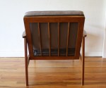 These are 2 mid century modern chairs with solid wood frames and a splayed leg design. The first chair has a slatted back, and contoured seat. Dimensions: seat width: 15.5″, seat depth: 17.5″, seat height: 18.5“, back height: 32″. The second chair has a curved spindle back. Dimensions: seat width: 19.5″, seat depth: 17″, seat height: 17“, back height: 28″.