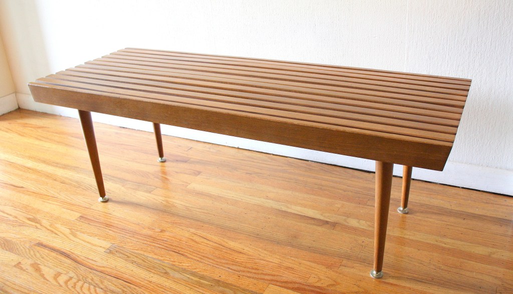 This is a mid century modern slatted coffee table bench with angled edges and tapered legs. Dimensions: 36″W x 18″D x 16″H.