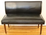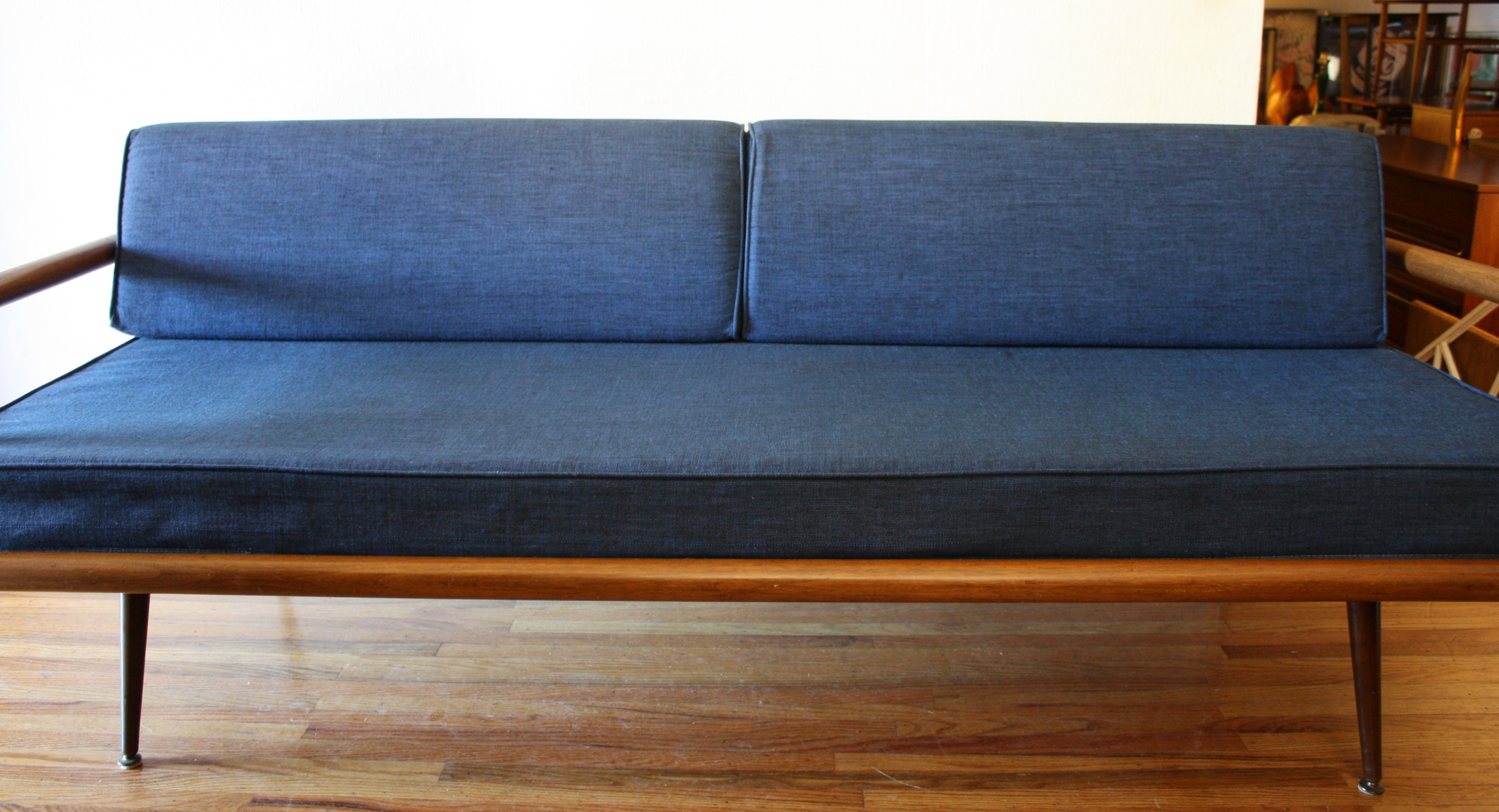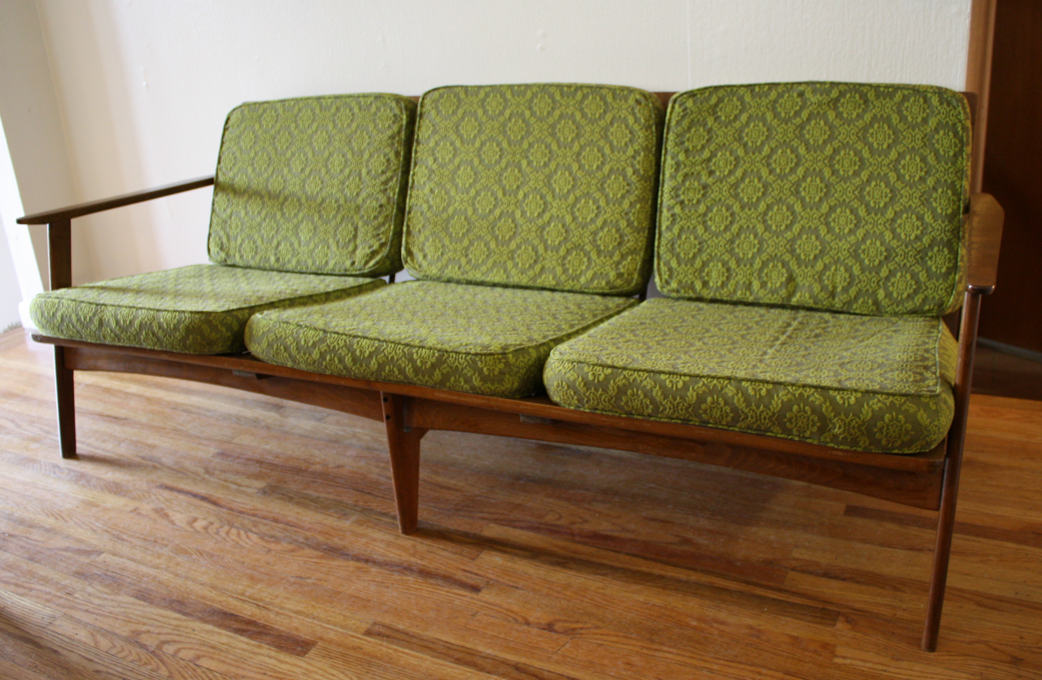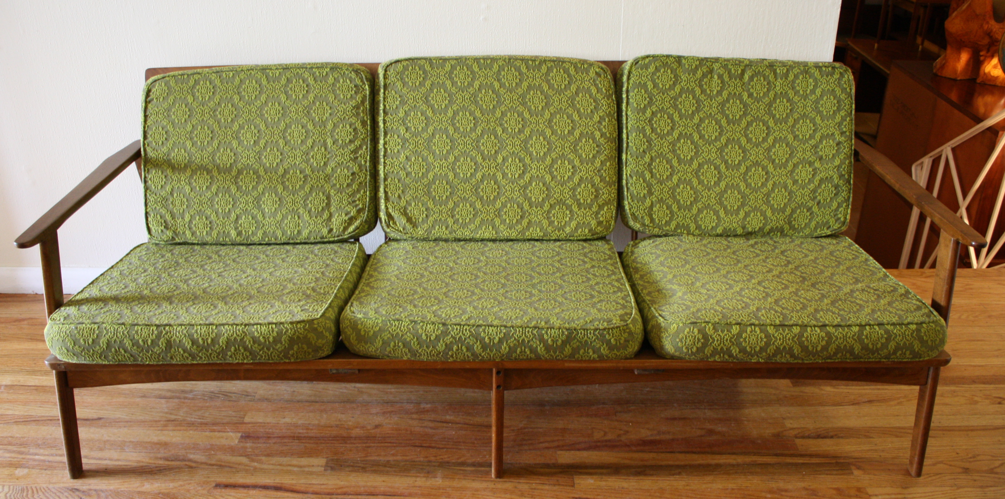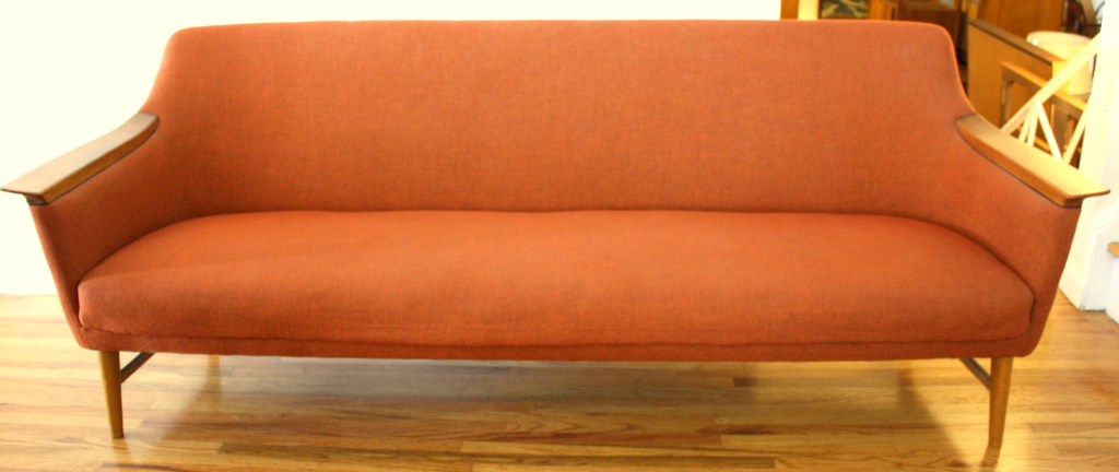 This is a mid century modern tufted sofa with upholstered bentwood arms and tapered legs. It is upholstered in a cheerful sunflower yellow tweed. Dimensions: seat width: 72.5″, seat depth: 20″, seat height: 15.5″, back height: 30.5″.