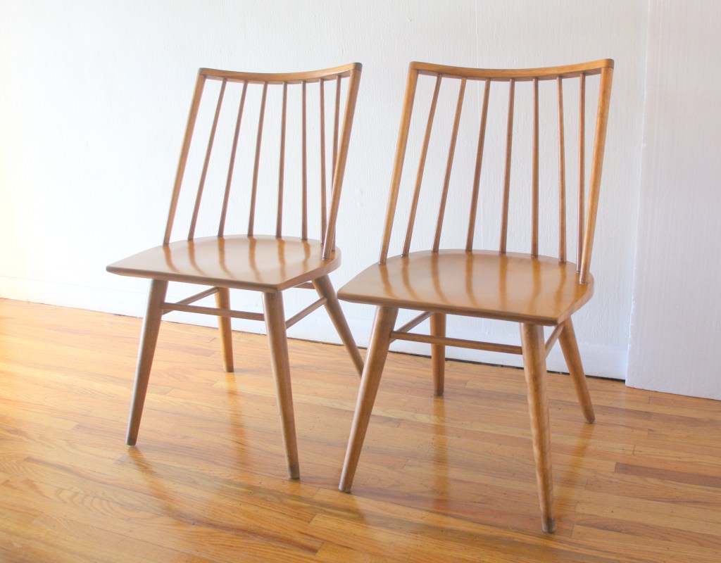 This is a pair of mid century modern Modernmates chairs by designed by Leslie Diamond for Conant Ball. They have solid wood frames with beautiful curved Windsor style spindle backs, and splayed tapered legs. Dimensions: seat width: 17″, seat depth: 17″, seat height: 17″, back height: 32″.