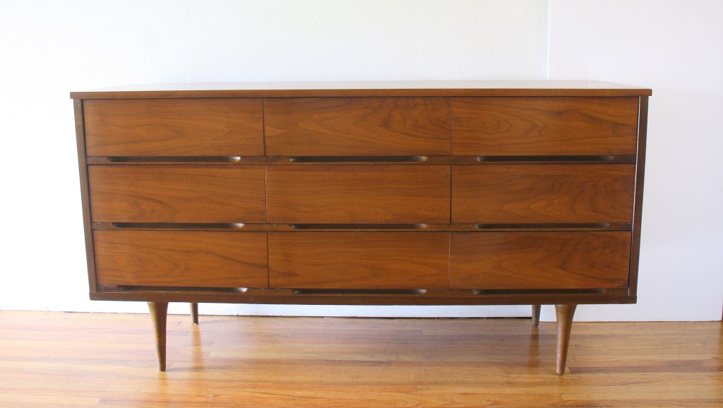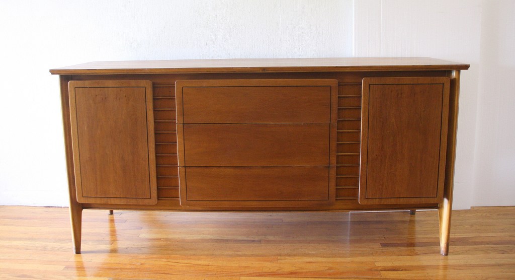 This is a mid century modern low dresser credenza by Bassett. It has six dovetailed drawers with a streamlined design and brass accented pulls, and brass tipped tapered legs. Dimensions: 54″W x 18″D x 32″H.