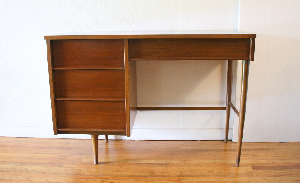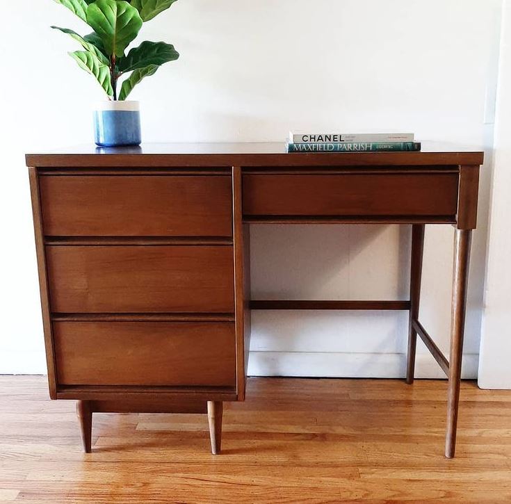 These are 2 mid century modern low dresser credenzas by Bassett. The first has 6 dovetailed drawers with a streamlined design, angled drawer pulls, and tapered legs. Dimensions: 52″W x 18″D x 30″H. The second has 6 dovetailed drawers with carved wood handles, and tapered legs. Dimensions: 54″W x 18″D x 30″H.