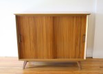 This is a Danish teak console credenza with easy sliding tambour doors. It has 4 adjustable shelves (2 shown in pic, 2 more included), a clean curved design with complementary rounded door pulls. Dimensions: 47″Q x 20″D x 26″H.