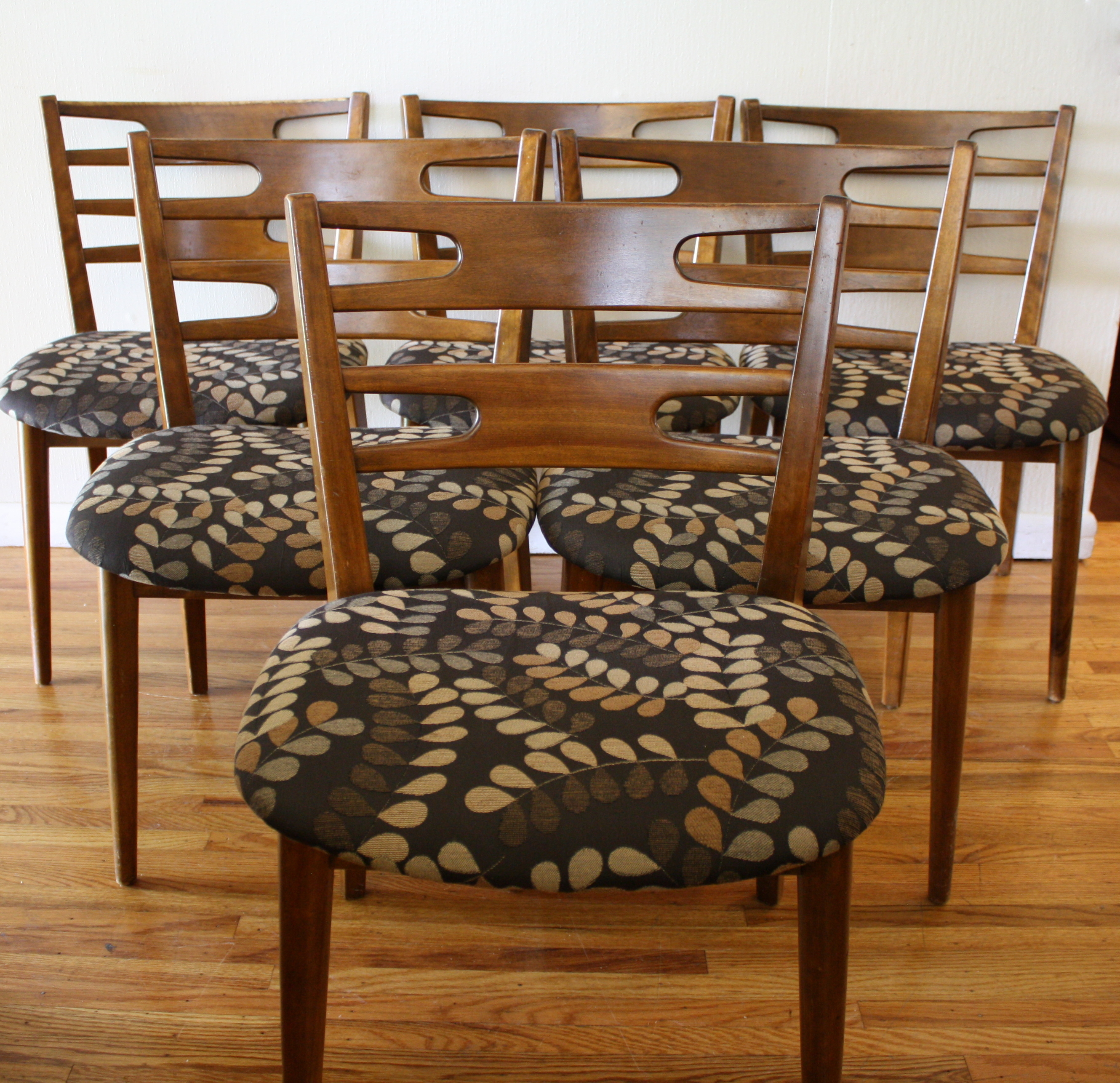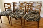 This is a mid century modern dining table designed by Kipp Stewart for Drexel. This beautiful solid wood table has the tapered surfboard edge design, tapered legs and a gorgeous wood grain. Dimensions: 60″W x 40″D x 29″H. There is an extension leaf that adds 22″ to the width.