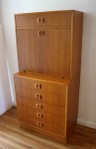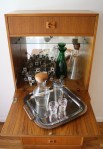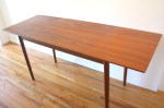 This is a mid century modern set of 3 Danish teak nesting tables. Each table has a teak frame and a tile top with a vibrant sunburst abstract design. The two smaller tables slide underneath the longer table. Dimensions: Larger table: 33″W x 17″D x 18″H. Smaller tables: 13″W x 13″D x 15″H.