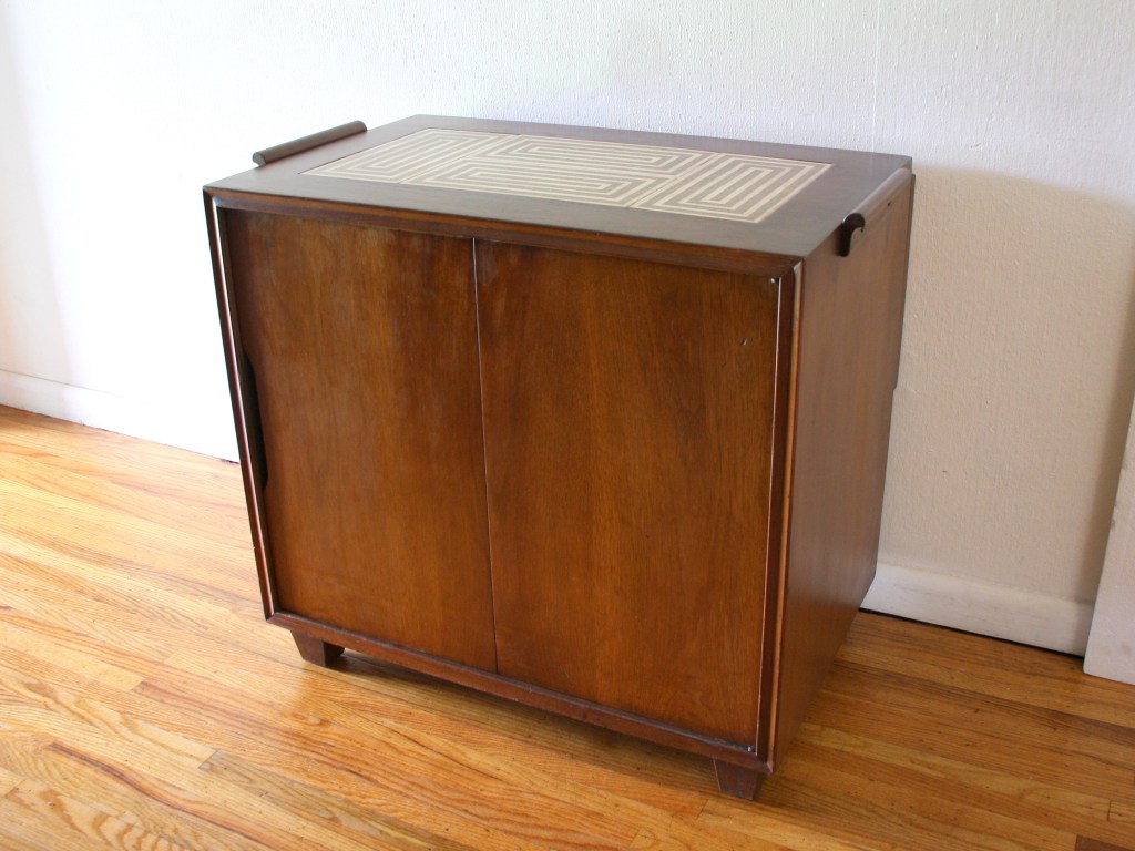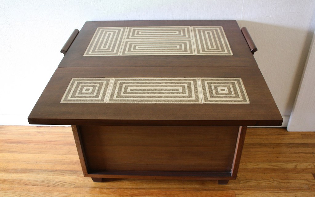 This is a mid century modern set of 3 Danish teak nesting tables. Each table has a teak frame and a tile top with a vibrant sunburst abstract design. The two smaller tables slide underneath the longer table. Dimensions: Larger table: 33″W x 17″D x 18″H. Smaller tables: 13″W x 13″D x 15″H.