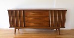 This is a mid century modern tall dresser by United that has five dovetailed drawers with beautiful diamond cut outs in its design and sculpted tapered legs. The third drawer has convenient dividers. Dimensions: 40″W x 19″D x 43″H.