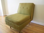 This is a mid century modern upholstered lounge chair. Cool simple streamlined style, a very comfortable seat, and tapered legs. Dimensions: seat width: 22″, seat depth: 21″, seat height: 15.5″, back height: 30″