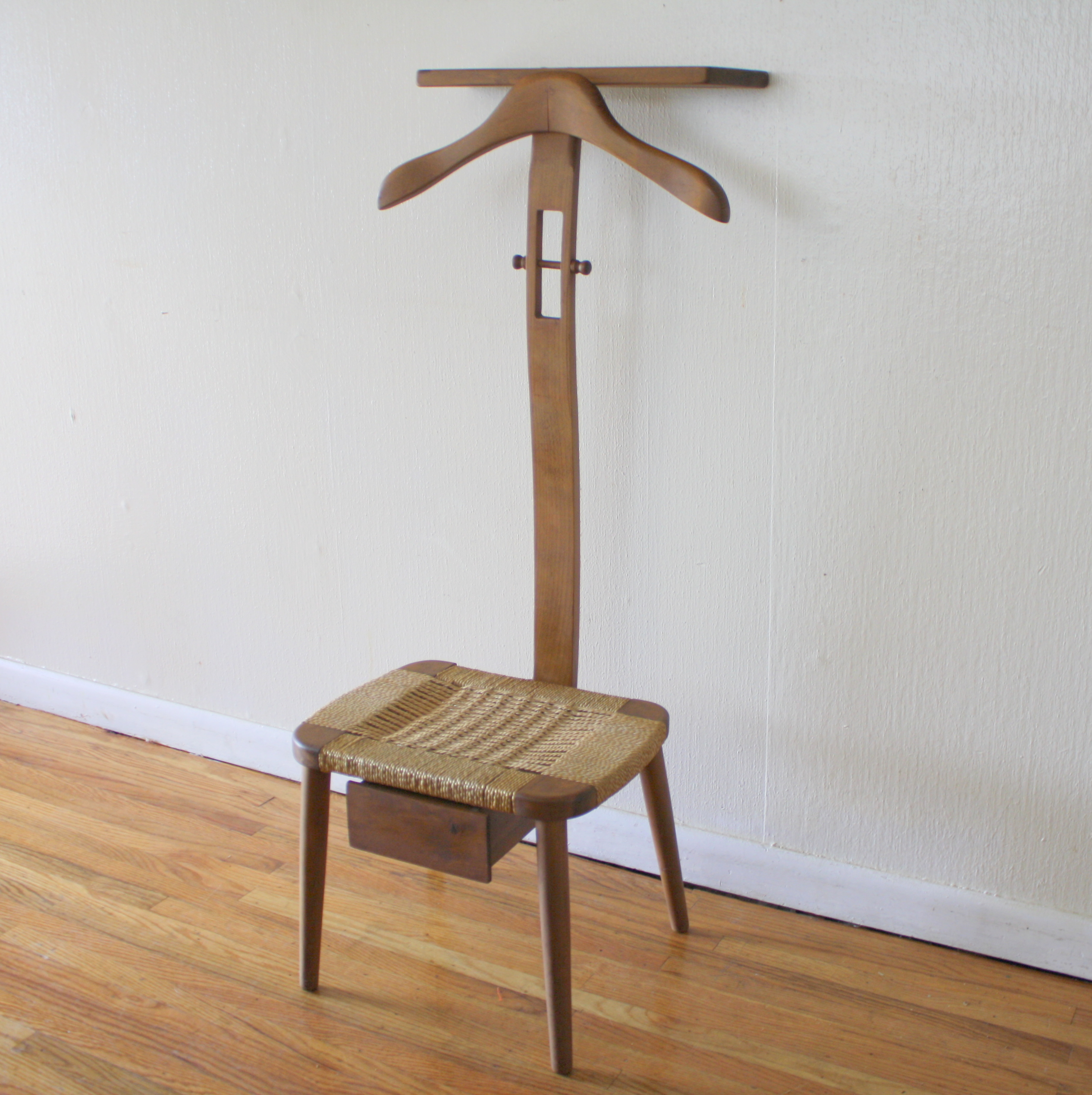 This is a mid century modern valet with a woven seat, solid wood hanger and valet tray, and drawer.