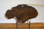 This is a mid century modern coffee table bench with a smoothly polished live edge English Chestnut wood slab top that has a gorgeous wood grain. The base is cast iron in the style of designer George Nelson. Dimensions: 48″W x 18″D x 18.5″H.